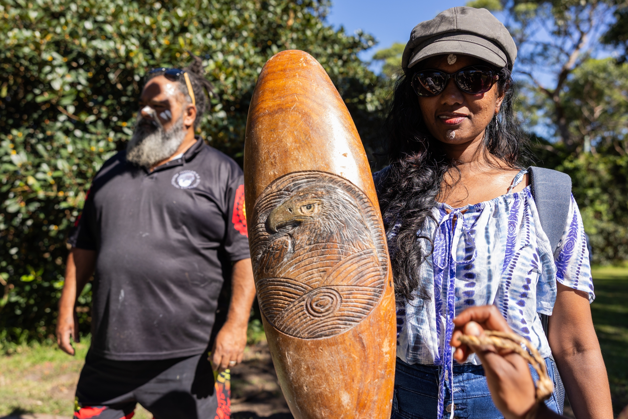 Scholar Kumudini (right) holding a shield shared by Richard Campbell, a member of the Yuin Nation (background), during the Bundeena Indigenous Bush Walk.