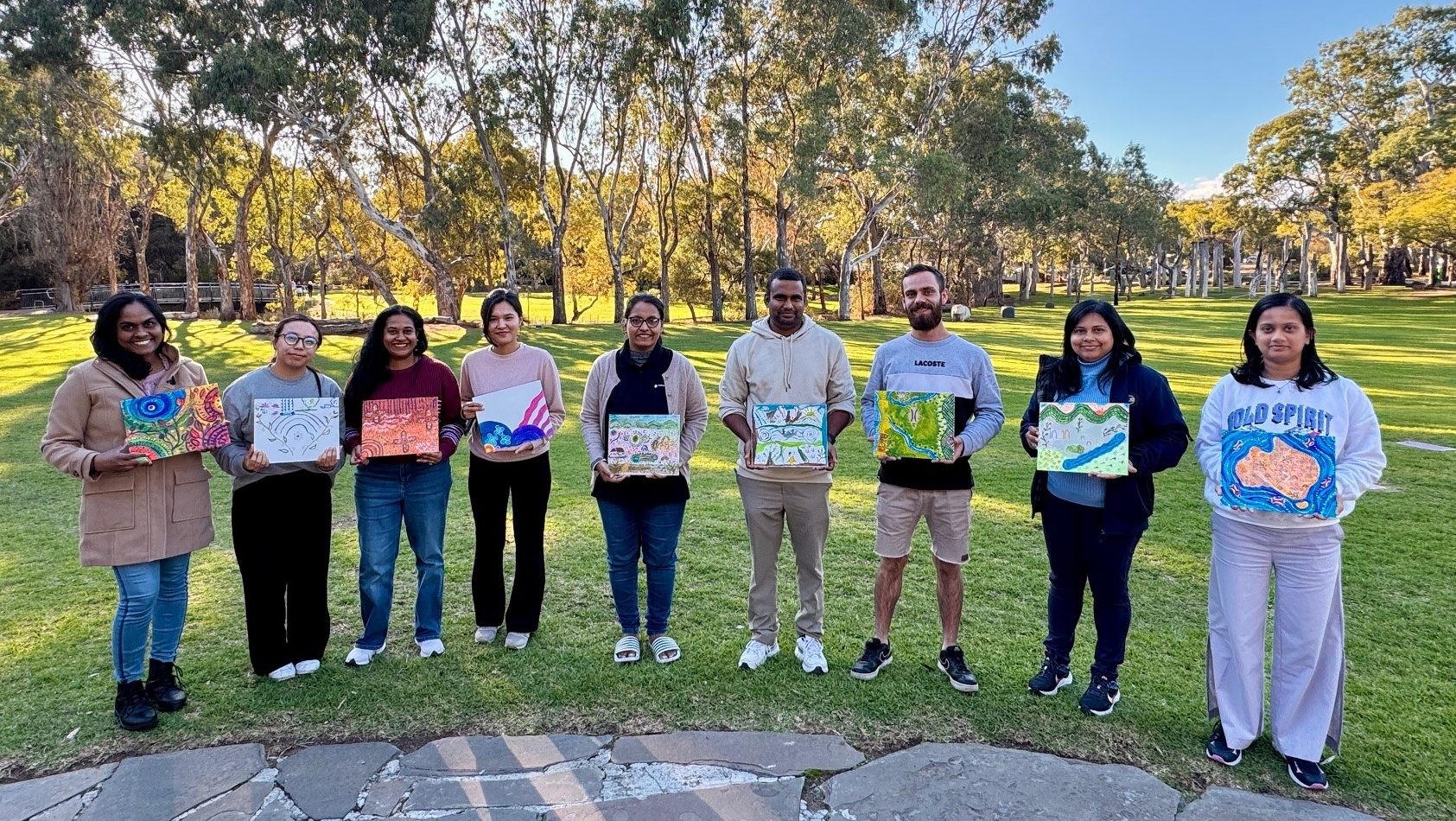 In Adelaide, scholars visited the Living Kaurna Cultural Centre, a 100% Aboriginal owned establishment, where they participated in an Aboriginal art class led by Brye, a local Indigenous artist. Brye began the session by sharing stories of the land, emphasising the role of art in preserving cultural knowledge, strengthening social bonds, and expressing connection to Country through symbols and forms. Scholars then created their own artworks, each accompanied by a personal narrative reflecting the meaning behind their designs. The scholars also learnt about the history of the Warriparinga wetlands and viewed an 800-year-old scarred tree, a living testament to the area’s deep history.